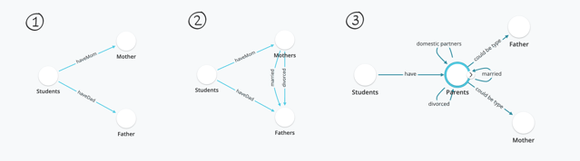 First we thought each student had one mother and one father (1), then we realized that they could have multiple mothers and fathers due to divorce and remarrying (2), then we realized that same-sex domestic partners adopting might make it more accurate to introduce the more general concept of "parents" which can be connected to each other in different ways and be of different types like "mother" and "father" (3). This third model is not only more representative of present reality, but more scaleable to include additional dynamics that might become important to include as we collect even more data.